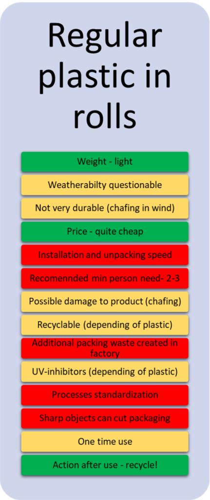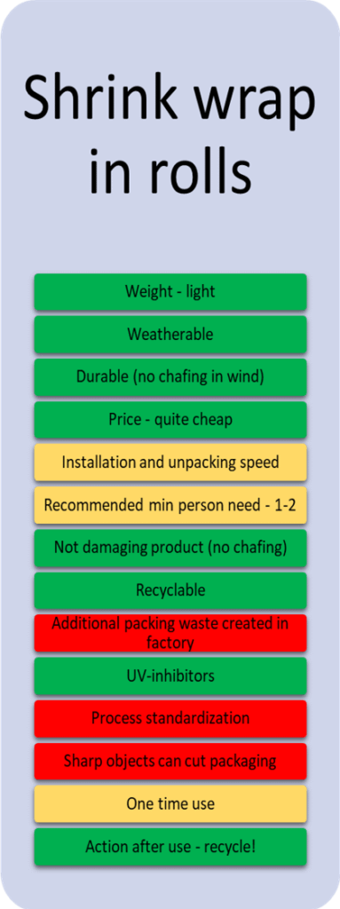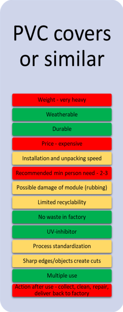Wenn die Module bereit sind, an ihren Bestimmungsort versandt zu werden, ist es bereits zu spät, sich zu fragen, wie wir sie während des Transports und der Lagerung schützen werden. Diese Punkte sollten als Teil Ihres Projektzyklus im Voraus geplant werden, denn je nach der gewählten Lösung können sich die Projektkosten gerade so weit verändern, dass sich Ihre Gewinnspanne um einige Punkte erhöht. Ungeeignete Verpackungstechniken können zu Verzögerungen beim Versand der Module, zu mehr Kranstunden und Wartezeiten beim Transport führen, ganz zu schweigen von der Gefahr, dass Ihr Verpackungsmaterial während des Transports und bei Wind verloren geht, was zu mehr Arbeit und zur Bearbeitung von Schadensfällen führt. Verschiedene Ansätze haben ihre eigenen Vor- und Nachteile. Traditionellere Verpackungsmethoden sind entweder das Verpacken mit normalem Kunststoff (Material in Rollen), das Verpacken mit PVC-Hüllen (oder ähnlichen Typen), das Verpacken mit Schrumpffolie aus Kunststoff (Material in Rollen) oder Mischlösungen aus allen oben genannten Methoden.