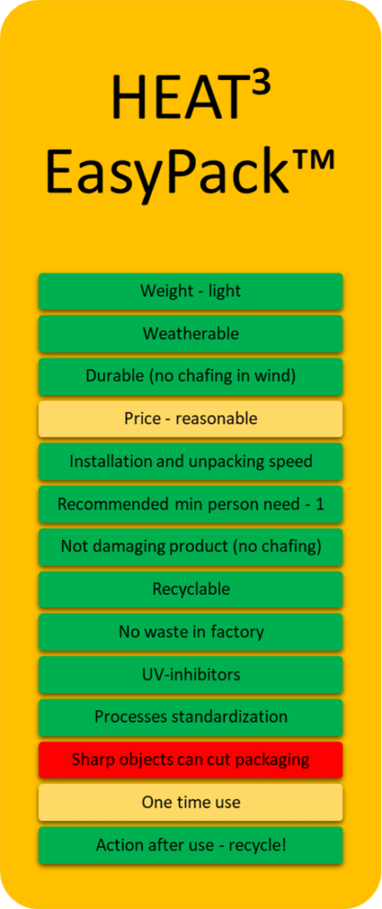 Der Modulhersteller hat die Möglichkeit, das/die Modul(e) selbst zu verpacken oder einen Fachmann für diese Aufgabe zu beauftragen, aber HEAT³ empfiehlt den Nutzern, dies mit der vollen Unterstützung von HEAT³ (Schulung, kostenlose Richtlinien und kostenlose Beratung) selbst zu tun, damit mehr Geld „im Haus“ bleibt. Mit HEAT³ EasyPack™ haben Modulhersteller einen effizienteren standardisierten Prozess, ein Minimum an Personal, das mit dem verpacken beschäftigt ist, und, nicht zu vergessen, glücklichere Verpackungsarbeiter und fröhlichere Modulinstallateure auf der Baustelle.